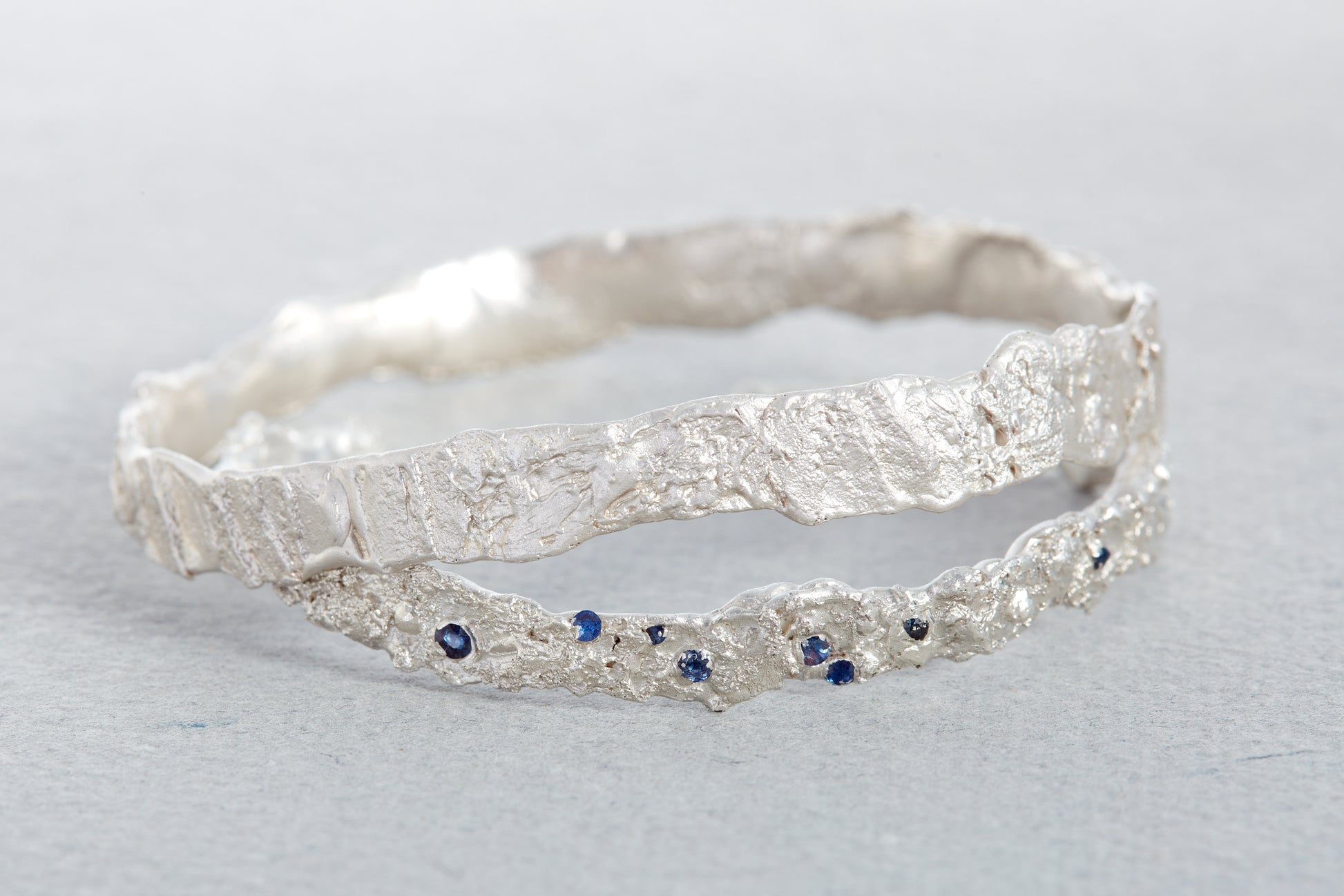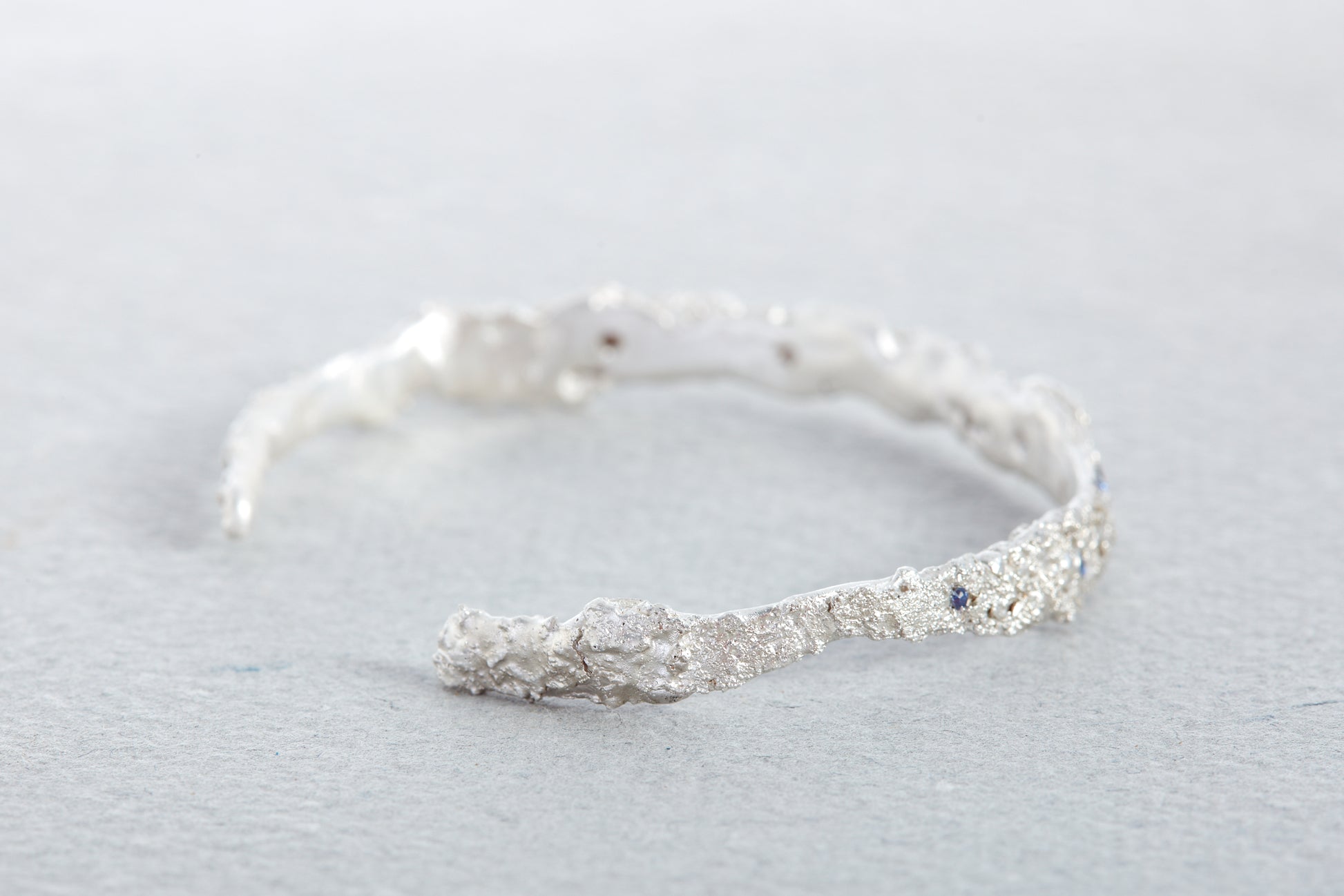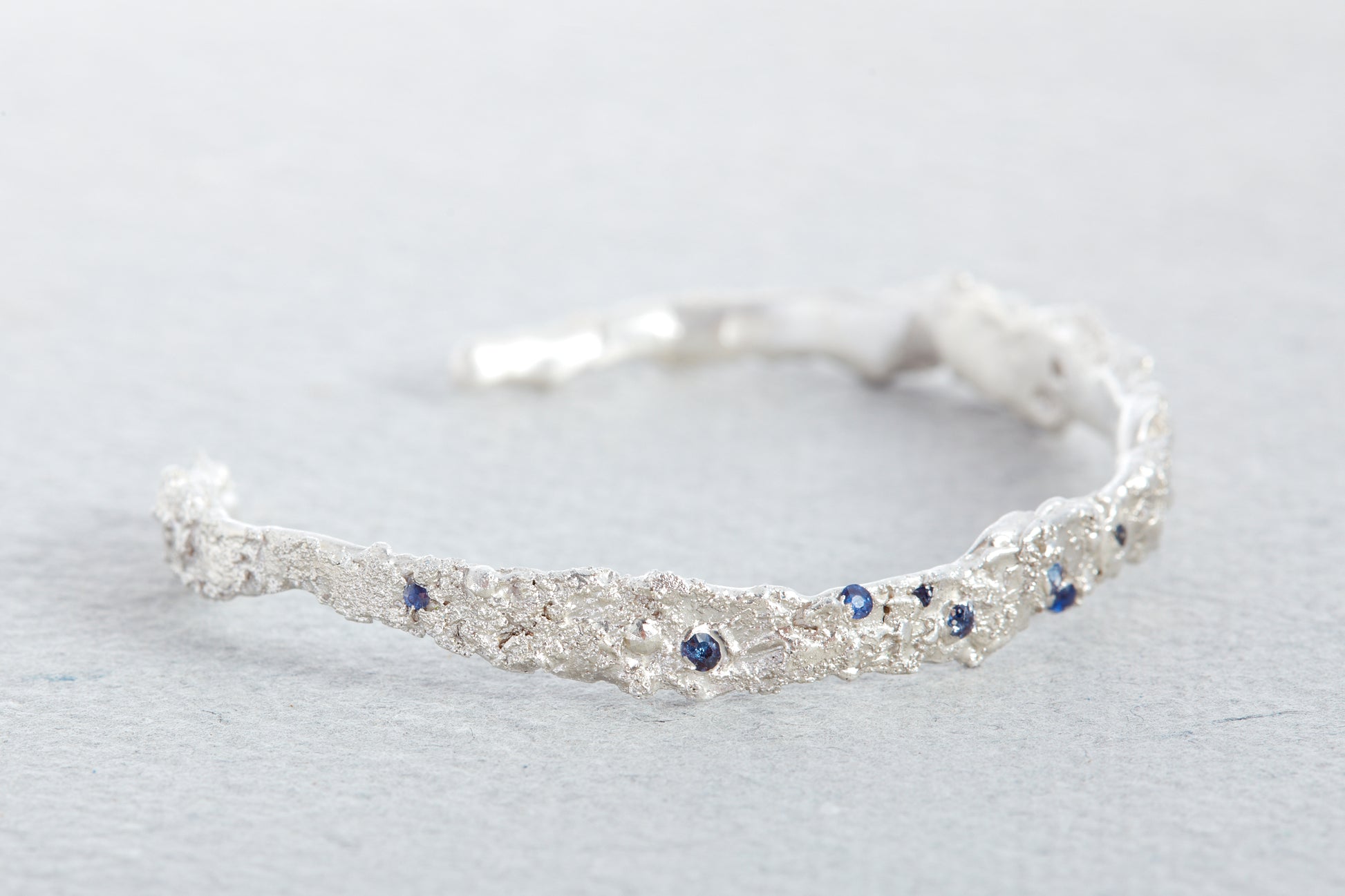 A sculptural, handcrafted cuff with organic texture and form. Blue sapphires are nested within the surface, catching the light and adding depth to the piece.
