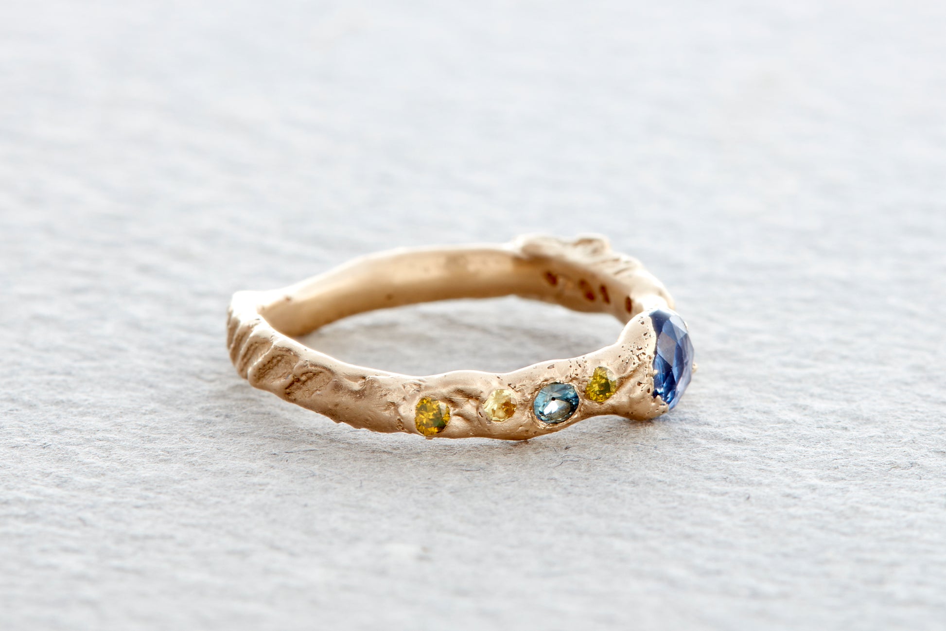 A blue rose-cut natural sapphire is organically set in gold, surrounded by rich texture. The band is scattered with sapphires in shades of blue, teal, and green, alongside subtle greenish-yellow diamonds, creating a modern reflection of the sea and its shifting light — a sculptural, wearable tidal treasure.
